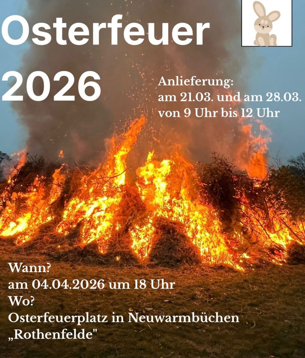 Wie jedes Jahr veranstalten wir am Ostersamstag, 04.04.2026 ab 18 Uhr auf dem Festplatz am Rothenfeld in Neuwarmbüchen das Osterfeuer. Für Speisen und Getränke ist wie immer gesorgt. Wir bieten nun zusätzlich auch Kartenzahlung an.